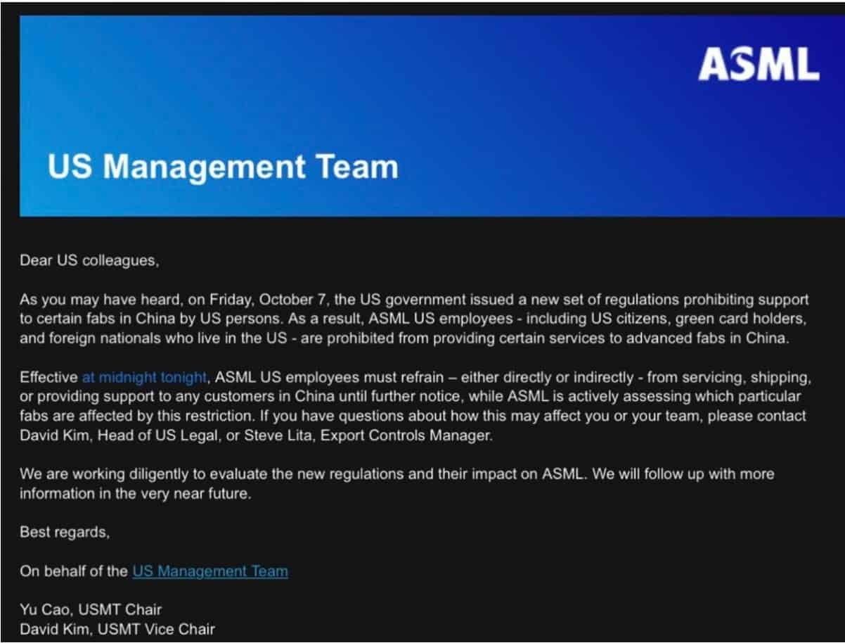 ASML, wiodący na świecie dostawca sprzętu litograficznego do produkcji najnowocześniejszych chipów, powiedział w komunikacie dla personelu , że wszyscy pracownicy amerykańscy – w tym obywatele USA, posiadacze zielonej karty i cudzoziemcy mieszkający w USA – mają teraz zakaz świadczenia usług na rzecz fabryki w Chinach.