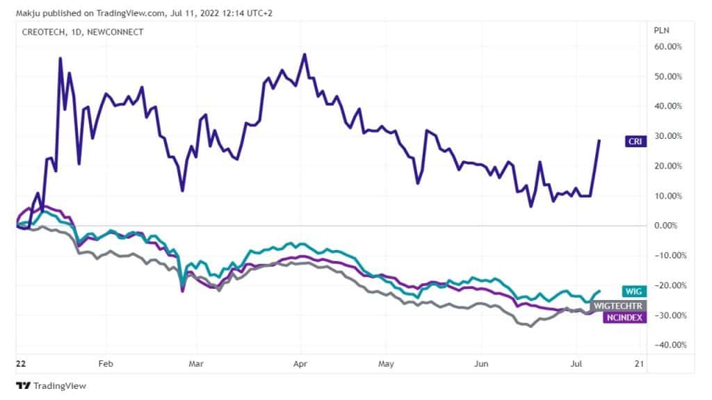 Od dłuższego czasu na polskim parkiecie akcji panują trudne warunki, a bessa pogłębia się systematycznie. Główne indeksy – WIG i NC Index obu segmentów obrotu – straciły od 12 października 2021 do 8 lipca 2022 odpowiednio ok. 27% i ok. 37%. Na tle tych rezultatów akcja Creotech jawią się jako oaza spokoju i instrument, który daje zarabiać w wymagającym otoczeniu rynkowym. W analogicznym okresie papiery spółki poszły w górę o ok. 98%. Przyzwoita stopa zwrotu ? Chyba nawet bardziej niż przyzwoita.