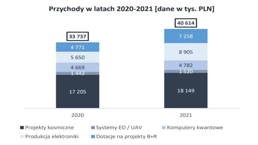 Biznes operacyjny spółki opiera się na kilku filarach. Głównym źródłem przychodów są projekty kosmiczne. W 2021 roku stanowiły one ok. 45% przychodów operacyjnych powiększonych o dotacje na prace rozwojowe. Dość podobną strukturę firma odnotowała rok wcześniej – wówczas projekty kosmiczne odpowiadały za ok. 51% przychodów.