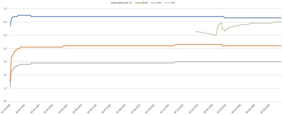 W połowie lutego tego roku miała miejsce premiera gry na konsole nowej generacji PS5. Wypadła ona lepiej od swoich poprzedników, ale również szczególnie w pierwszych dniach nie wzbudziła zachwytu. Oceny na metacritic po trzech dniach to jedynie 6 – aktualnie 6,7. Poniżej zestawienie ocen na metacritic dla konsol i PC, które to prowadzę regularnie od premiery Cyberpunk2077. (Osobiście, nigdzie jeszcze nie natrafiłem na tego typu dane):