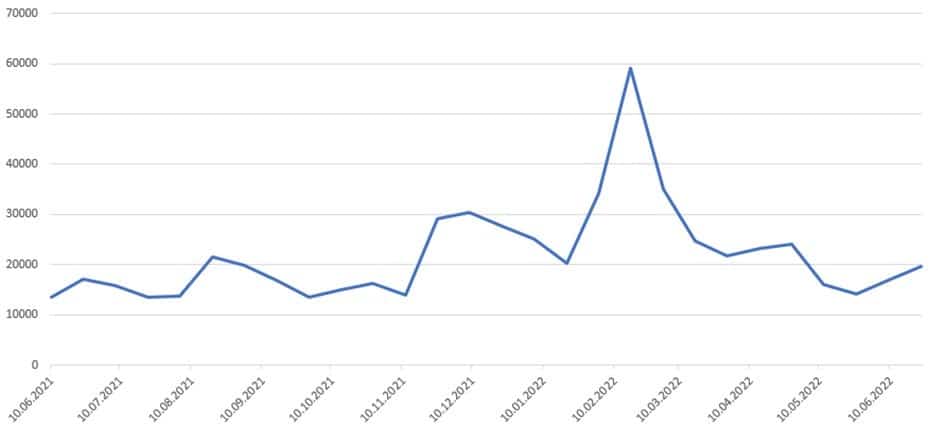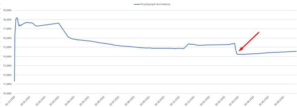 O ile poziom ocen PC na metacritic wygląda dość stabilnie, o tyle na steamdb jest zmienność. Wykres niestety jest dość mocno zaburzony przez informację o wycofaniu się CDR z rynku rosyjskiego w związku z inwazją na Ukrainę (moment ten zaznaczyłem strzałką na wykresie):