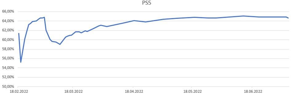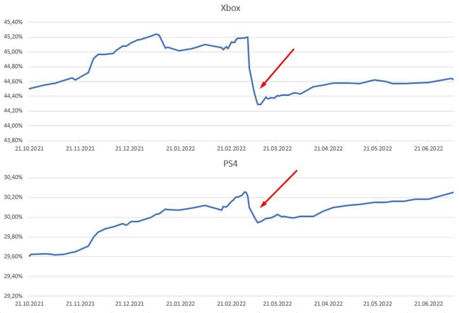 Również jeżeli przyjrzymy się bliżej oceną na konsole, zauważymy wyraźny spadek po wycofaniu z Rosji. O ile oceny na PS4 „odbudowały” stratę, o tyle Xbox nadal jest zdecydowanie niżej niż przed wybuchem wojny: