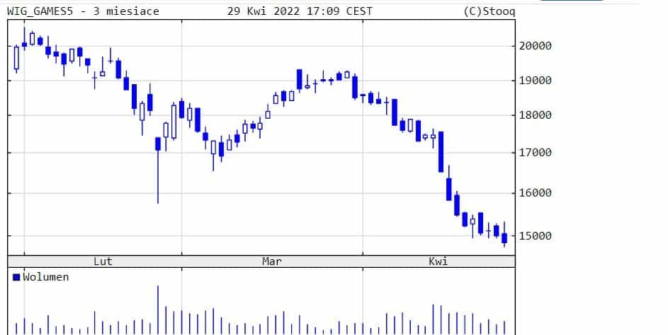 I tak dalej; każdy z indeksów ma inne mnożniki i depozyty – przykładowo futures na WIG.GAMES nie ma mnożnika, czyli wartość kontraktu odpowiada bezpośrednio jego kursowi rynkowemu. Ma też dość wysoki depozyt, czyli 13 procent minimalny, a 15,60 procent wstępny. Jest tak z uwagi na jego dużą zmienność, można to zobaczyć na poniższym wykresie.