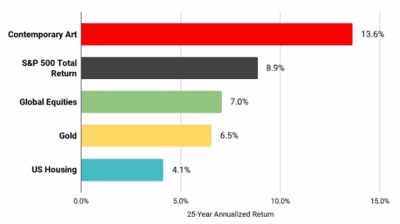 Patrząc na liczby, skok, jaki wykonał rynek sztuki – zwłaszcza w Polsce – jest w istocie imponujący. Zarówno krytycy, jak i inwestorzy wskazują, że tego rodzaju aktywa mają wiele plusów. Mając formę realnego przedmiotu oraz wartość niematerialną, jaką prezentuje koncept i wykonanie, są w pewnym sensie instrumentami ponadczasowymi. Sztuka to obecnie jeden z najbardziej dynamicznych rynków. Według danych przedstawionych m.in. przez analityków z firmy Masterworks, średnioroczna stopa zwrotu w ciągu ostatnich 25 lat wyniosła dla sztuki współczesnej 13,6%. Jest to dwa razy więcej niż dla złota, które zanotowało wynik 6,5%.