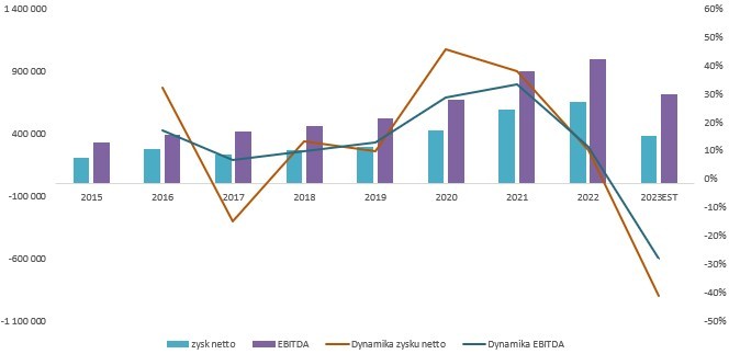 Na poniższym wykresie naniosłem prognozowany zysk netto i EBITDA co daje ogólny obraz tego co czeka KTY w nadchodzącym roku: