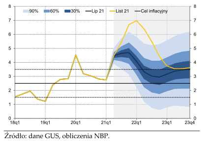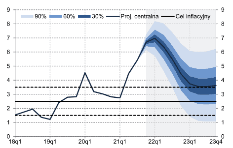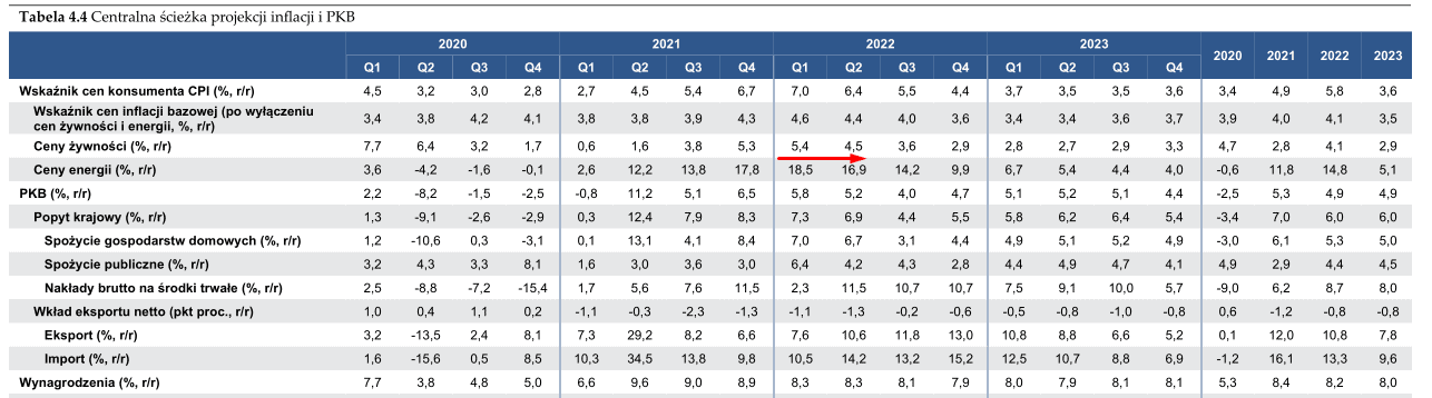 NBP szacuje szczyt CPI w pierwszym kwartale 2022 na poziomie 7,0%, w kolejnych kwartałach ma ona spadać osiągając 4,4 % na koniec roku. Co ciekawe w drugim kwartale 2022 szacowany jest procentowy spadek r/r cen energii i żywności: