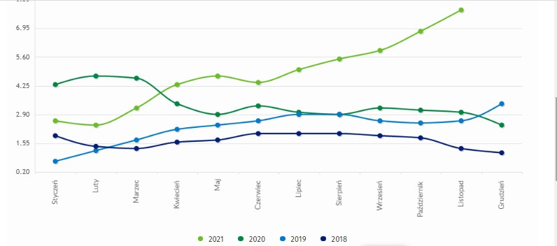 Tak mniej więcej wyglądała inflacja w 2021 roku w porównaniu do lat poprzednich: