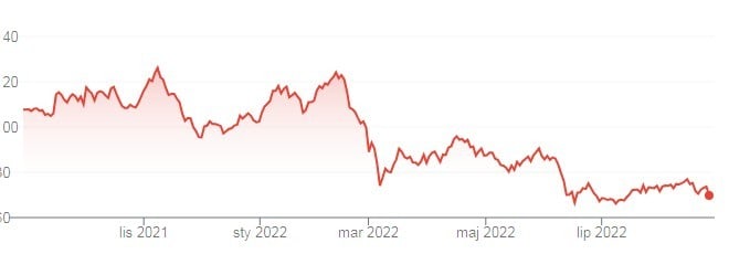 Na Ryanair od dłuższego czasu widać stagnację na pozycji zysków netto/zysków operacyjnych (od przynajmniej 2018 r.). Przekłada się to na kurs akcji, który od 2018 r. właśnie przebiega w długoterminowym trendzie bocznym.