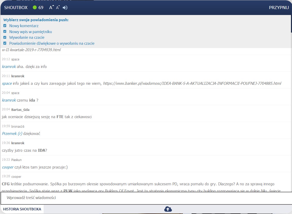 Powiadomienia dostępne są po kliknięciu na ikonkę głośnika. Do wyboru są powiadomienia o: