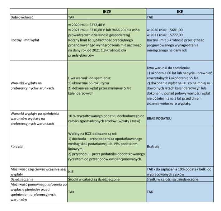 Poniżej w formie tabeli zestawiłem różnice między IKE oraz IKZE, roczne limity, warunki wypłaty na preferencyjnych warunkach itp.: