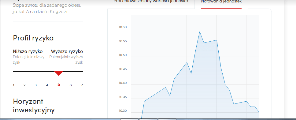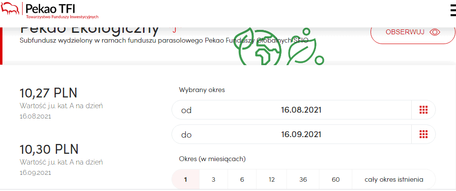 Pekao TFI Ekologiczny przewiduje ryzyko inwestycyjne na 5 lat. W związku tym przeznaczony jest dla klientów gotowych poczekać na owoce swoich inwestycji nieco dłużej. Minimalna pierwsza wpłata dla inwestorów zainteresowanych funduszem to 1 tysiąc złotych. Natomiast wartość aktywów na dzień 31.08.2021 wynosi łącznie 1,04 milionów złotych.