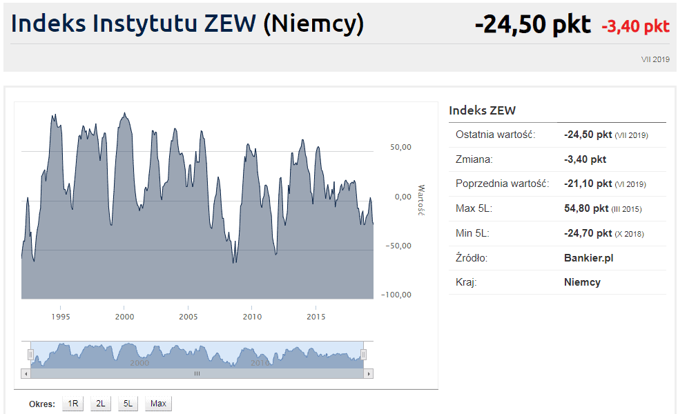 W sierpniu opublikowano odczyt niemieckiego instytutu ZEW (Zentrum für Europäische Wirtschaftsforschung) zajmującego się zobrazowaniem opinii i nastrojów dotyczących rozwoju sytuacji gospodarczej w Niemczech. Ten odczyt wyniósł -44,1 pkt przy konsensusie wynoszącym -28,5 pkt i lipcowym odczycie -22,3 pkt.