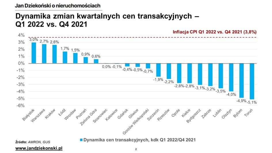 Tymczasem AMRON opublikował raport cen transakcyjnych za 1Q22 w porównaniu do 4Q21. Wśród 22 analizowanych miast tylko w 7 ceny wzrosły w ostatnim kwartale (uwaga – wzrost był wolniejszy niż inflacja)! 15 miast na nominalnym spadku:
