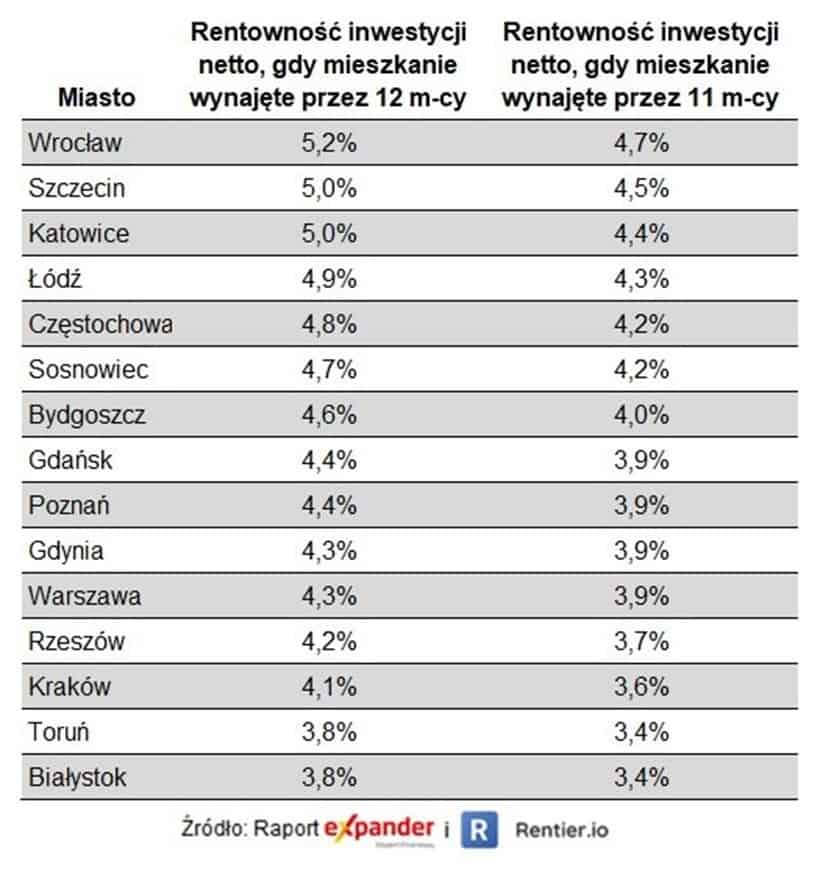 Bardzo częsty argumentem osób zakładających, że ceny na rynku nieruchomości nie będą spadały, a wręcz dalej będą rosły – jest argument mówiący o dużym procencie transakcji zakupów gotówkowych – czy będąc inwestorem posiadającym odpowiedni poziom gotówki (przy niepewnym runku nieruchomości) i tak atrakcyjnych oprocentowaniach lokat i obligacji uważacie, że inwestycja w nieruchomości jest słusznym wyborem? Spójrzmy na rentowność inwestycji netto w wybranych polskich miastach przy najmie przez pełen rok kalendarzowy oraz przy pełnych jedenastu miesiącach: