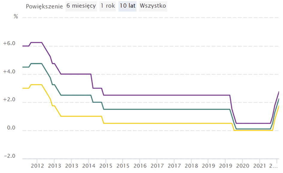 I w tej chwili są one wyższe niż przed pandemią koronawirusa – co więcej są najwyższe od marca 2015. W dużym uproszczeniu – dla każdej osoby posiadającej kredyt hipoteczny w złotówkach, która zawarła umowę kredytową po marcu 2015 roku, kolejne raty kredytu będą wyższe niż dotychczas. W szczególności zmiany te odczują osoby, które zawierały kredyt w czasie pandemii. Właśnie wtedy, stopy procentowe wynosiły 0,1% a WIBOR 3M 0,21%: