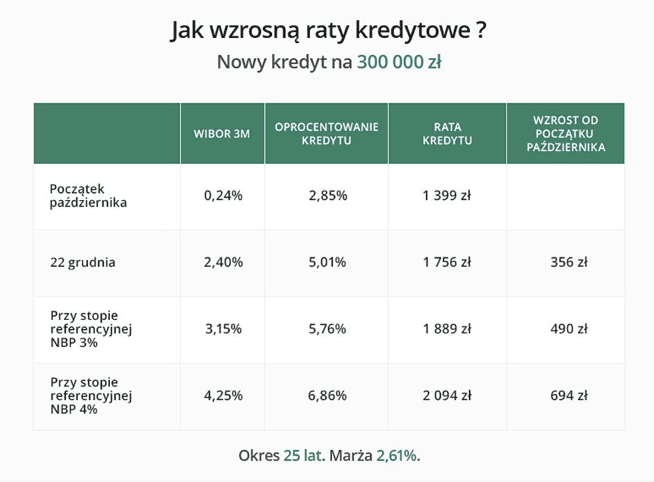 Posłużę się tutaj przykładem wyliczeń wykonanym przez biznes.interia.pl. Pokazuje on, jak wygląda zmiana wysokości miesięcznej raty kredytu hipotecznego zaciągniętego na 25 lat, na 300 tysięcy przy marży 2,61%:
