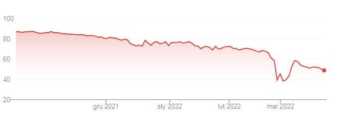 Sankcje, narzucane na rosyjski rynek przez Amerykę i Unię Europejską, rozszerzają się regularnie. Choć na pierwszy rzut oka wydają się potężne, w istocie mają swoje słabe strony. Jest to już widoczne, między innymi na przychodach z ropy. Część firm traci jednak na ograniczeniach, a jedną ze spółek, która mocno na nich ucierpiała, jest firma Sovcomflot, posiadająca łącznie około 110 tankowców. Są to zarówno małe statki, jak i bardzo duże jednostki, mogące przewozić jednorazowo ponad 2 miliony baryłek ropy. Według doniesień agencji Bloomberg, cypryjskie biuro należące do spółki, najprawdopodobniej będzie musiało się zamknąć. Proces ten może nastąpić już 15 maja. W lutym na firmę spadły sankcje europejskie i amerykańskie, a pod koniec marca brytyjskie. Sovcomflot musiał ograniczyć swoją działalność na Cyprze, a z biegiem kolejnych dni, firma zaczęła mocno tracić. Widać to wyraźnie na poniższym wykresie (choć pod koniec marca notowania znowu nieco wzrosły).