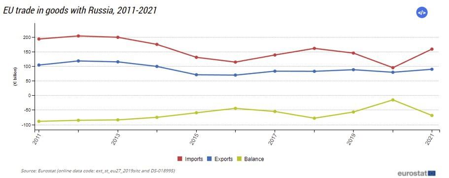 Relacje importu i eksportu między EU a Rosją na przestrzeni ostatnich dziesięciu lat, oscylowały na zbliżonych poziomach. Był to raczej trend spadkowy, przynajmniej jeżeli chodzi o import do EU (wyrażony kwotowo). Ostatni pandemiczny rok oraz wspomniany wzrost surowców przełożył się na zachwianie tego trendu: