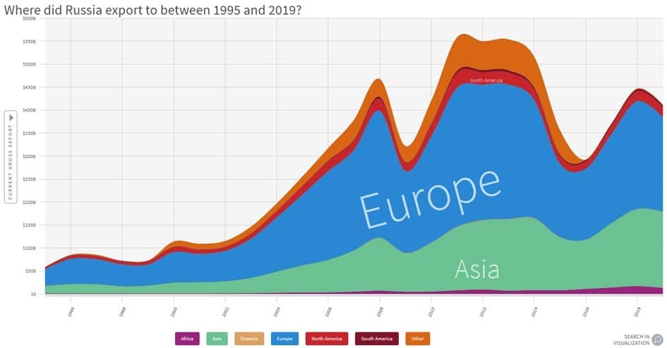 Rosja eksportuje ważne surowce i towary do Europy, Stanów Zjednoczonych i krajów na całym świecie. Jeżeli chodzi o gaz ziemny to w szczególności Europa jest w dużej mierze zależna od Rosji. W ostatnich miesiącach, Europa była świadkiem czegoś w rodzaju próby generalnej przed redukcją rosyjskiego gazu. Moskwa ogranicza dostawy do Europy, co zdaniem niektórych analityków i polityków jest próbą utrzymania wysokich cen. Według Międzynarodowej Agencji Energetycznej w ostatnim kwartale 2021 r. Rosja ograniczyła eksport gazu rurociągami do Europy o 23% w porównaniu z tym samym okresem rok wcześniej. Jednocześnie rośnie import gazu skroplonego. W ciągu ostatniego roku ceny NAG w Europie osiągnęły rekordowe poziomy :