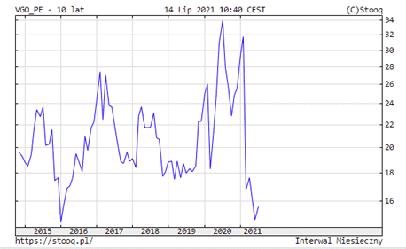 Aktualnie VGO ma historycznie niski poziom wskaźnika P/E ~15: