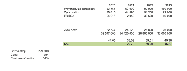 Warto jednak w sowich szacunkach wziąć pod uwagę, że zysk netto za 4 kwartał 2020 obarczony jest zdarzeniem jednorazowym w postaci rozpoznaniu aktywa z tytułu podatku odroczonego na kwotę 13,9 mln zł z tytułu wykorzystania ulgi inwestycyjnej w Tarnobrzeskiej Specjalnej Strefie Ekonomicznej. Jeżeli „oczyścimy” zysk netto ze zdarzenia jednorazowego otrzymamy 6,6 mln zł zysku netto za 4 kwartał 2020 a wskaźnik cena do zysku to już nie 15, a 24 – czyli powyżej średniej z ostatnich lat, która kształtowała się na poziomie 20-22. Znając założenia zarządu co do przychodów w najbliższych latach oraz przyjmując rentowność netto na poziomie 36% jak miało to miejsce w ostatnich latach otrzymamy następujący szacowany wskaźnik C/Z na lata 2021-2023: