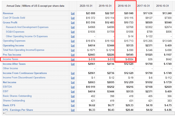 Jak widać wyraźnie spółka w roku 2018 zaraportowała ponadprzeciętne zyski EPS. W roku 2018 spółka otrzymała zwrot podatku w wyniku wejścia w życie ustawy o reformie podatkowej z 22 grudnia 2017: