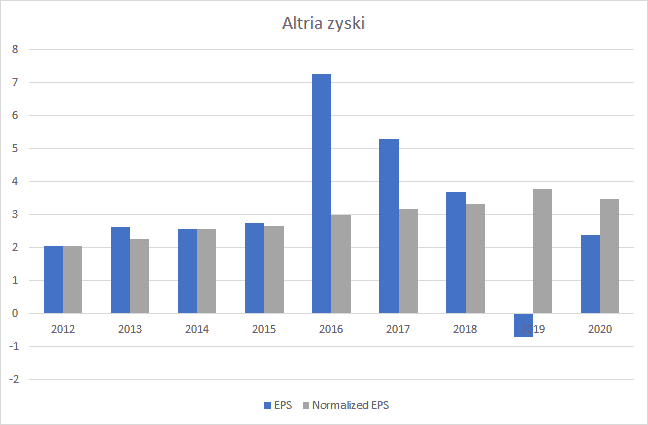 Zaprezentowałem powyżej trzy rodzaje zysków (chociaż można spotkać jeszcze zysk non-GAAP). Zastanówmy się, na jakim rodzaju zysków powinniśmy bazować podczas naszych analiz. Za przykład posłużą nam przede wszystkim dane finansowe spółki Altria (MO) za lata 2012-2020: