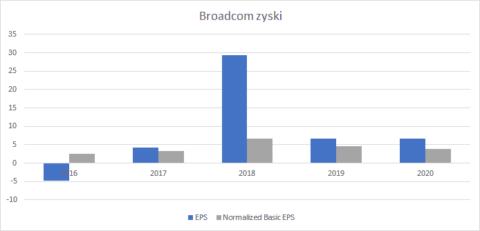 Jako drugi przykład spójrzmy na wyniki spółki Broadcom (AVGO) w latach 2016-2020: