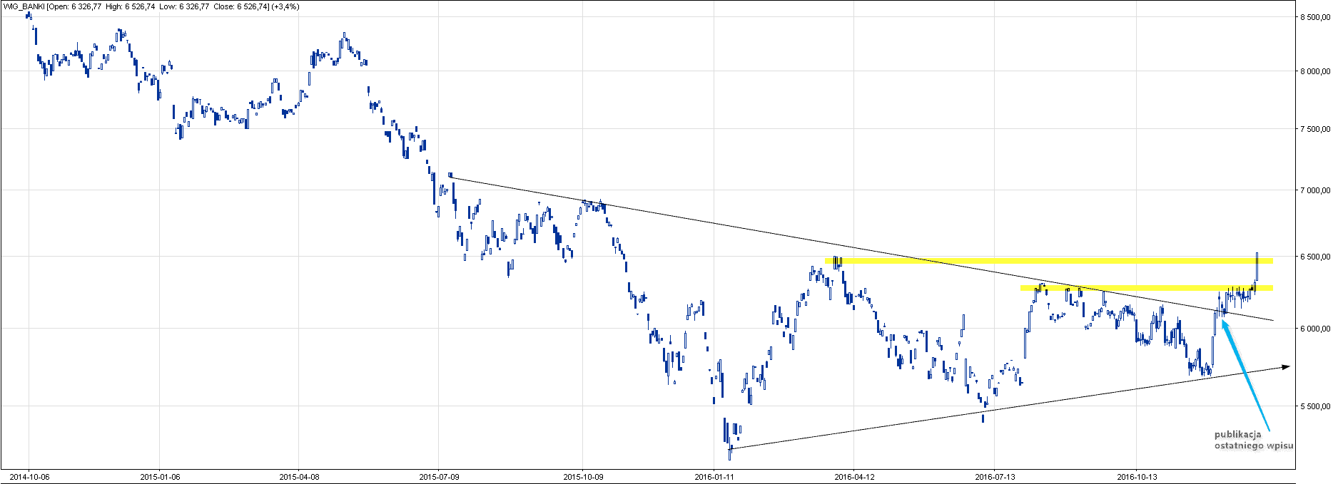 Dokładnie dzisiaj doszło do kolejnego wybicia z konsolidacji, co w konsekwencji powinno rozwinąć dalszy ruch w górę, wstępnie do poziomu ~6930 pkt. Płaska korekta, podobna do tej sprzed paru dni, byłaby najlepszym pomysłem na zdrowe i trwałe wzrosty w sektorze bankowym.