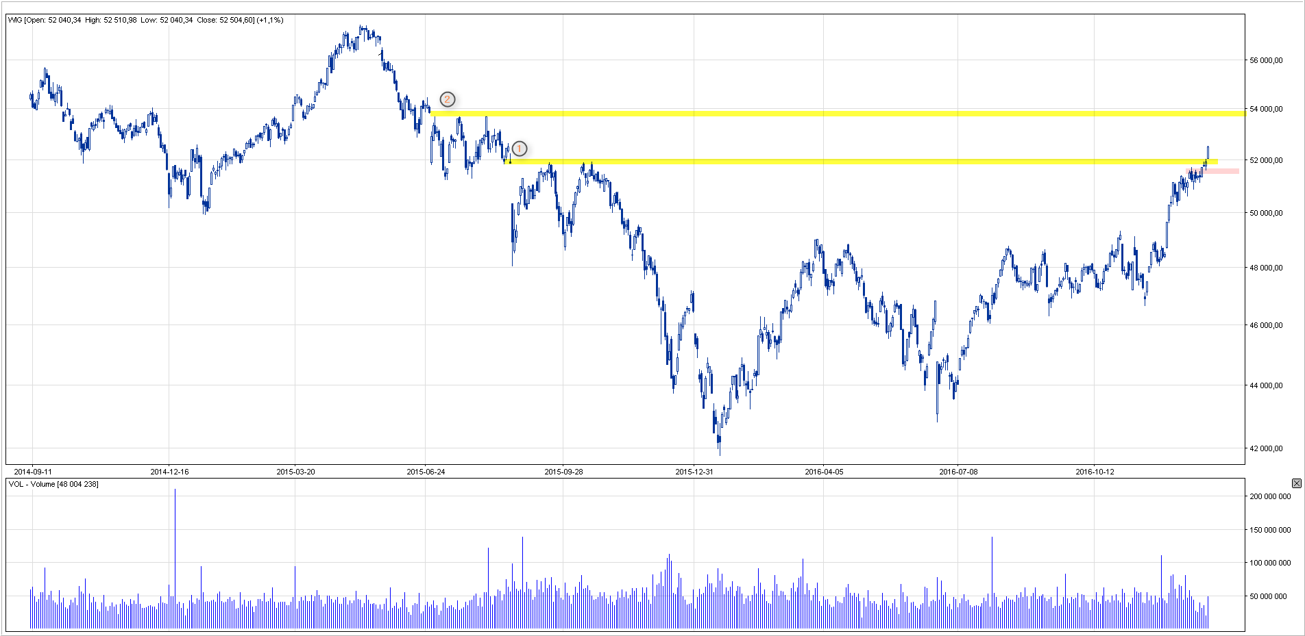 Szeroki rynek od początku roku kontynuuje rozpoczętą w grudniu dobrą passę forsując nielada opór na poziomie 52.000 pkt i domykając tym samym lukę spadkową z sierpnia 2015. Obecna sytuacja powinna po raz kolejny zmobilizować popyt, który atakować powinien następny opór pod 54.000 pkt, gdzie ulokowana jest kolejna luka spadkowa.