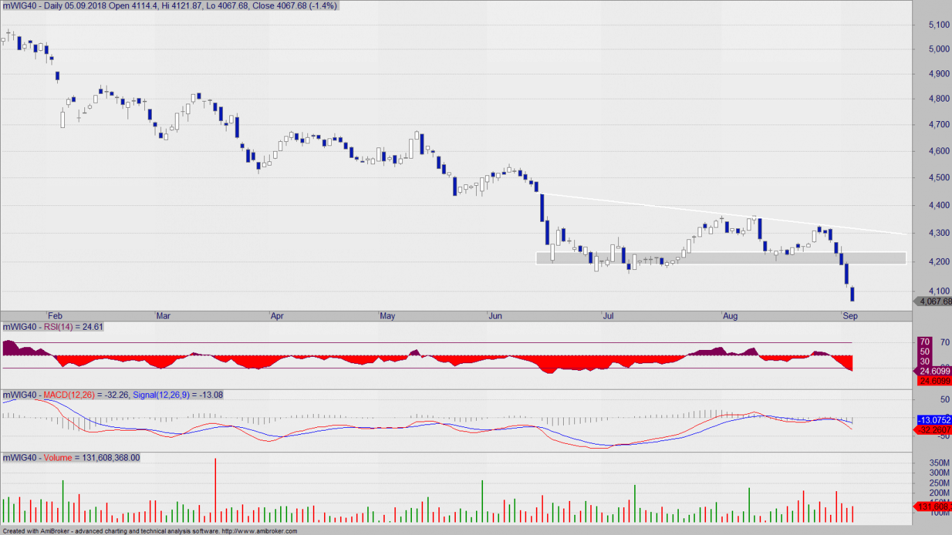 Analogiczna sytuacja jest na wykresie mWIG40, który także wyłamał się ze strefy wsparcia: