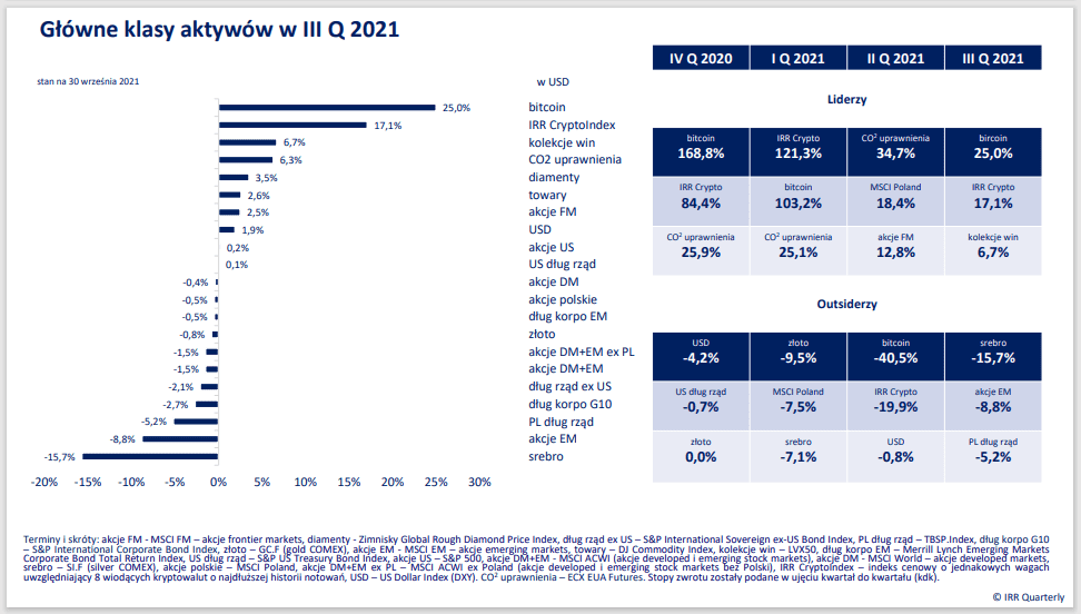 Najwięcej dały zarobić w trzecim kwartale 2021 kryptowaluty. IRR CryptoIndex, skupiający osiem najbardziej płynnych i o najdłuższej historii notowań kryptowalut, zyskał ponad 17 proc., a największy pod względem kapitalizacji bitcoin 25 proc. Cezurę 30 proc. wzrostów przekroczyły m. in. ethereum, XRP (dawny ripple), iota i qtum. Szczególnie wyróżnił się polski token – golem, który poszedł w górę o prawie 70 proc.