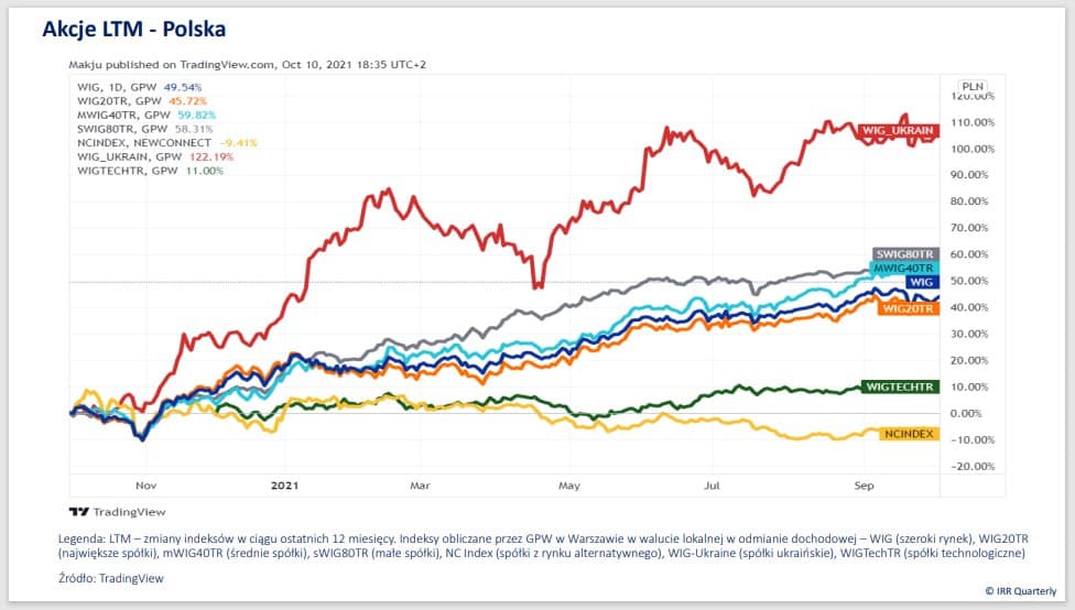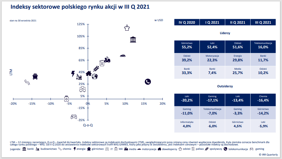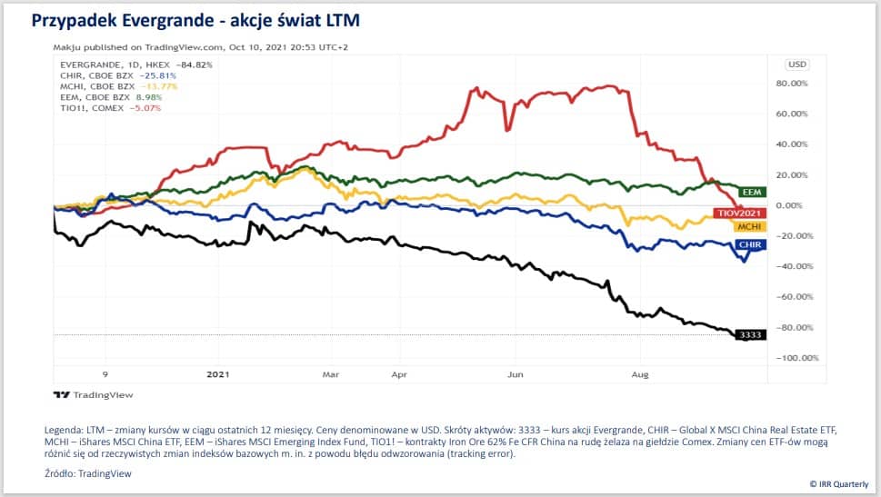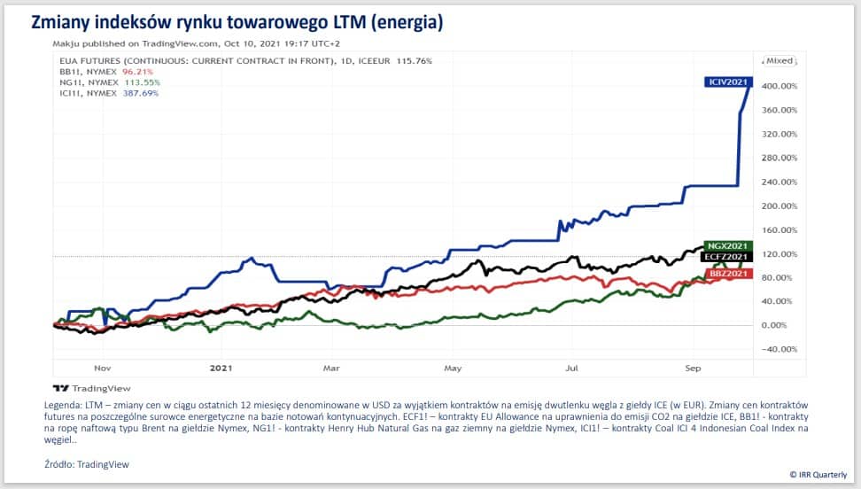 Warto mieć energię, a jeszcze bardziej wpływ na nośniki niezbędne do jej uzyskania. To pewnie myśl przewodnia, towarzysząca inwestorom, którzy obserwowali, w jak gwałtownym tempie rosną ropa naftowa, węgiel i gaz ziemny. Jasne sygnały, że era taniego pieniądza się skończyła wysyłało wiele banków centralnych. Fed zapowiedział rychłe nadejście taperingu i obniżenie skali skupu aktywów z rynku. Dot-plots FOMC przesunęły się w kierunku szybszego rozpoczęcia cyklu podwyżek stóp procentowych. Część banków centralnych, w tym przede wszystkim z gospodarek wschodzących (m. in. Czechy i Węgry), na dobre wdrożyła zacieśnianie polityki monetarnej. W tym otoczeniu całkiem dobrze radziły sobie inwestycje alternatywne. Uprawnienia do emisji dwutlenku węgla, kolekcje win i diamenty, ale także kryptowaluty. Słabo wiodło się z kolei inwestorom posiadającym w portfelach akcje i instrumenty dłużne. W Warszawie fanfary odtrąbiły historyczny rekord WIG w walucie lokalnej, ale gdyby skorygować jego wartość o stopę inflacji, a także porównać z zachowaniem się długoterminowym indeksów w USD z innych państw, to to osiągnięcie już tak nie smakuje. MSCI Poland stracił 0,5 proc. w USD kdk, ale to było nic w porównaniu z MSCI China, który poszedł w dół o prawie 19 proc. Powodów takiego zachowania się chińskich akcji było wiele. We wrześniu doszedł nowy. Chodzi o ryzyko bankructwa wiodącego dewelopera – Evergrande, który zdaniem niektórych mediów, specjalizujących się w legendach miejskich, miałby doprowadzić do krachu na miarę GFC 2008 – takie wnioski płyną z najnowszego raportu IRR Quarterly.