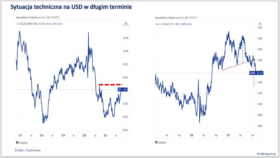 Dość ciekawie wygląda sytuacja na USD pod względem technicznym. Silna przecena najpowszechniejszej waluty rezerwowej świata z 2020 roku pozostaje coraz dalszym wspomnieniem. Od maja do końca września 2021 EUR/USD zniżkował z 1,22 do 1,16. W tym czasie para opuściła formację przypominającą wyglądem podwójny szczyt, który ukształtował się na przestrzeni październik 2020-sierpień 2021. Minimalny zakres ruchu po wyjściu dołem z tej formacji znajduje się w okolicach 1,13. To, że dojdzie do niego, może uprawdopodobnić pokonanie oporu ok. 95 pkt. na DXY.