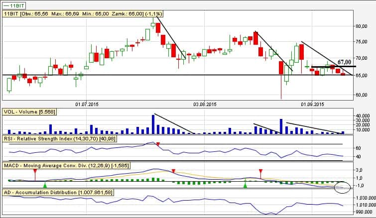Tworzy nam się wyraźne wsparcie na 65,00 zł. Przy tym kształtuje nam się pewnego rodzaju trójkąt zniżkujący przy wyraźnym, zmniejszającym się wolumenie. Podobne schematy również wcześniej mieliśmy (formacje flagi/kanały spadkowe). Zagrywamy więc spekulacyjnie na przebicie 67,00 zł.