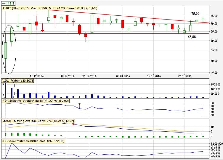 Po diabolicznych wzrostach na 11Bit (New Connect) przyszedł czas na miesięczny zastój. Jako, że my się specjalizujemy w łapaniu ciekawych okazji, węszymy ponownie ciekawy moment na walorze. Przez pewien jednak moment było zagrożenie wybicia dołem z formacji. Wtedy jednak pisałem, że docelowy, dolny bufor to rejony właśnie 63,80 zł. Nie został przebity. A tymczasem:
