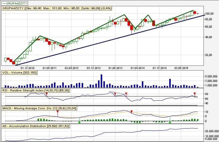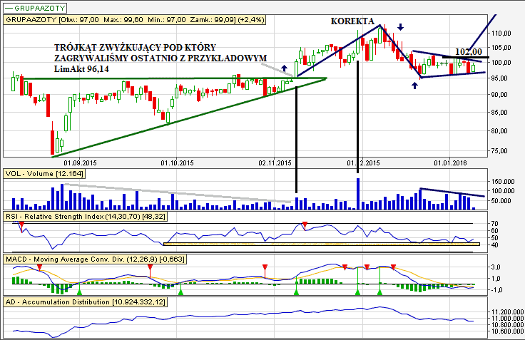 Grupę Azoty niedawno analizowaliśmy. Wtedy zagrywaliśmy pod wybicie z trójkąta zwyżkującego (analiza techniczna Grupa Azoty z dnia 05.11.15). Po wyhamowaniu korekty aktualnie znowu jest/będzie dogodne miejsce do inwestycji.