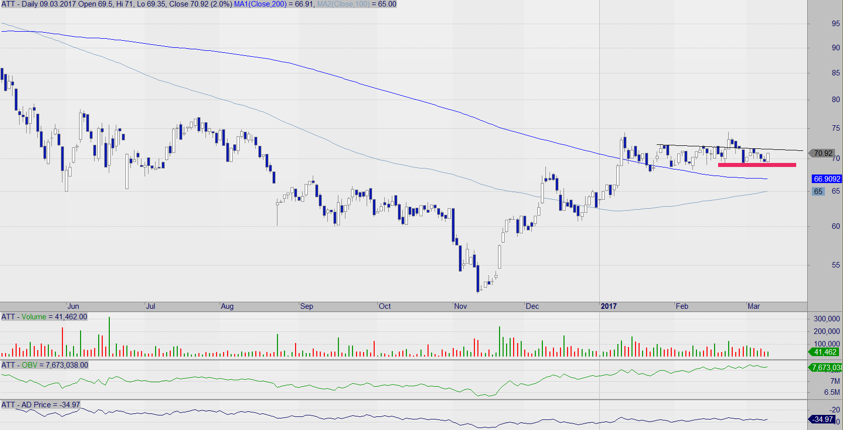 Grupa Azoty były na wczorajszej sesji jednym z walorów indeksu WIG30, które skutecznie broniły wsparcia. Takie zachowanie wskazuje na chęć do kontynuacji zwyżek, które rozpoczęły się pod koniec zeszłego roku. 11.01 doszło do przebicia się przez SMA200, a od tego czasu nie doszło do retestu wybicia, co sugeruje, że spadkowy charakter na jakiś czas został zażegnany. Akcje ATT handlowane są także na kontraktach z oznaczeniem FATTH17 dla serii marcowej, ale płynnością nie grzeszą.
