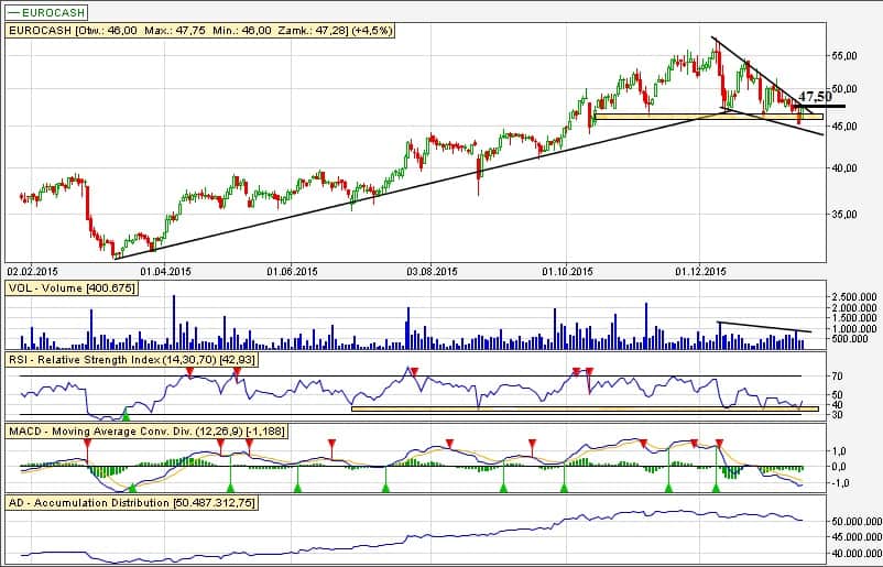 Eurocash – najlepiej ustawić SL lekko poniżej 47,36 zł (maksymalna strata przy aktywacji by wynosiła jedynie ~0,92%)