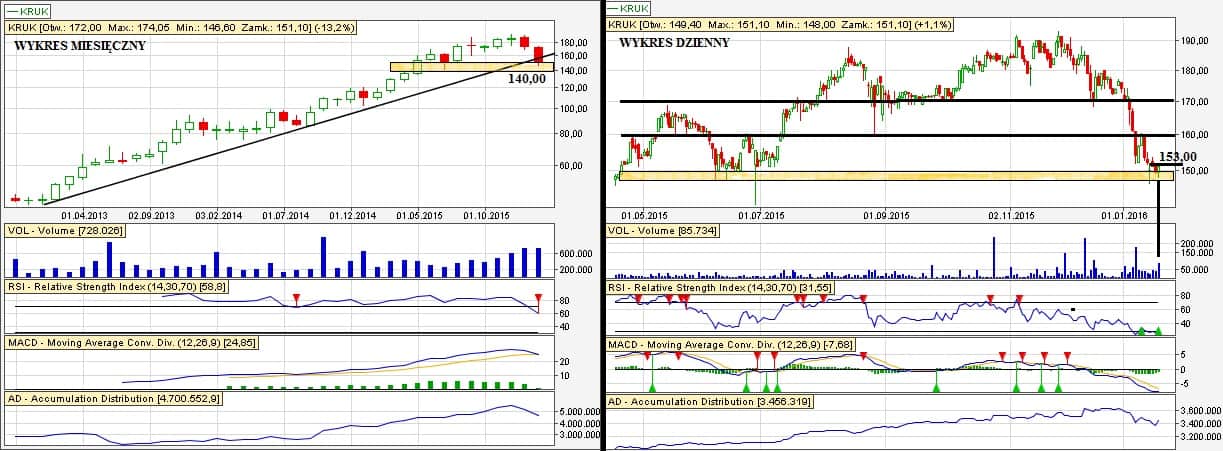 Zagrywamy pod potencjalne odbicie od mocnego wsparcia ~150 zł. Na wykresie miesięcznym widzimy, że linia trendu powoli jest “atakowana”, jednak o zmianie trendu możemy dopiero mówić po utworzeniu się nowego dołka – a więc w naszym przypadku po stałym przebiciu wsparcia 140,00 zł (druga metoda wyznaczania trendów obok przeprowadzania liń – metoda “dołków” i “szczytów”). Zagrywamy pod przebicie 153,00 zł