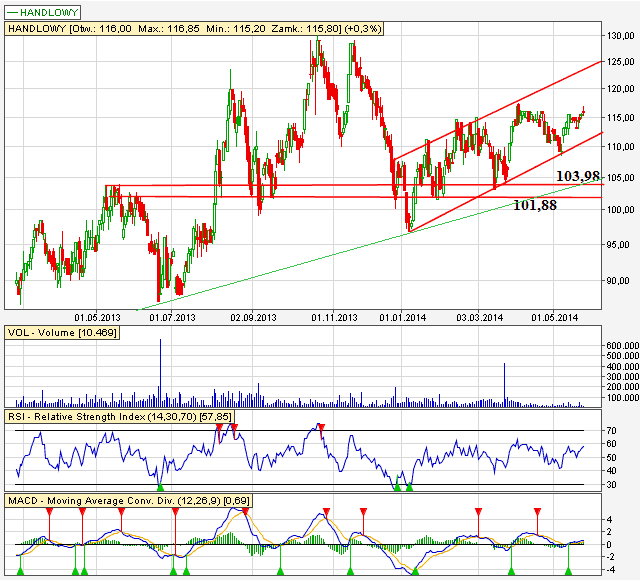 Kurs akcji Banku Handlowego znajduje się w 3-letnim trendzie wzrostowym (zielona linia na wykresie) oraz po gwałtownej korekcie z końca 2013, kurs porusza się w innym krótkoterminowym kanale wzrostowym. W chwili pisania analizy kurs akcji wynosi 115,80 zł. Również wskaźnik MACD dał niedawno mocny sygnał zakupy przecinając linię sygnału oraz poziom zerowy od dołu. Potencjalny wzrosty w okresie średnioterminowym to okolice 125 zł. Obszar wsparcia został narysowany na wykresie. Jego przebicie nic dobrego nie będzie wróżyć. Jednak większe prawdopodobieństwo jest, że kurs będzie się poruszać dalej wedle trendu (podstawa analizy technicznej).