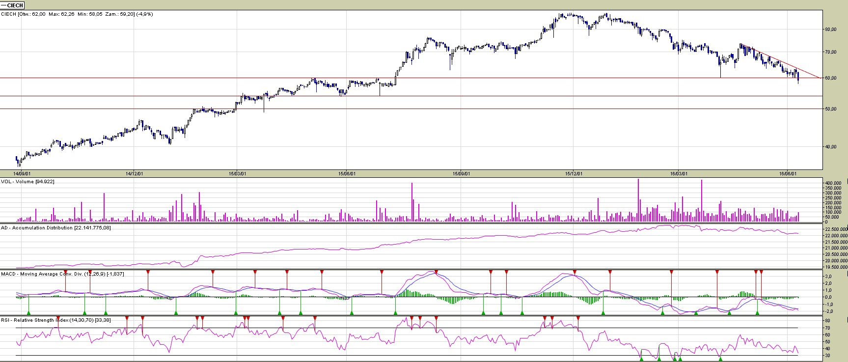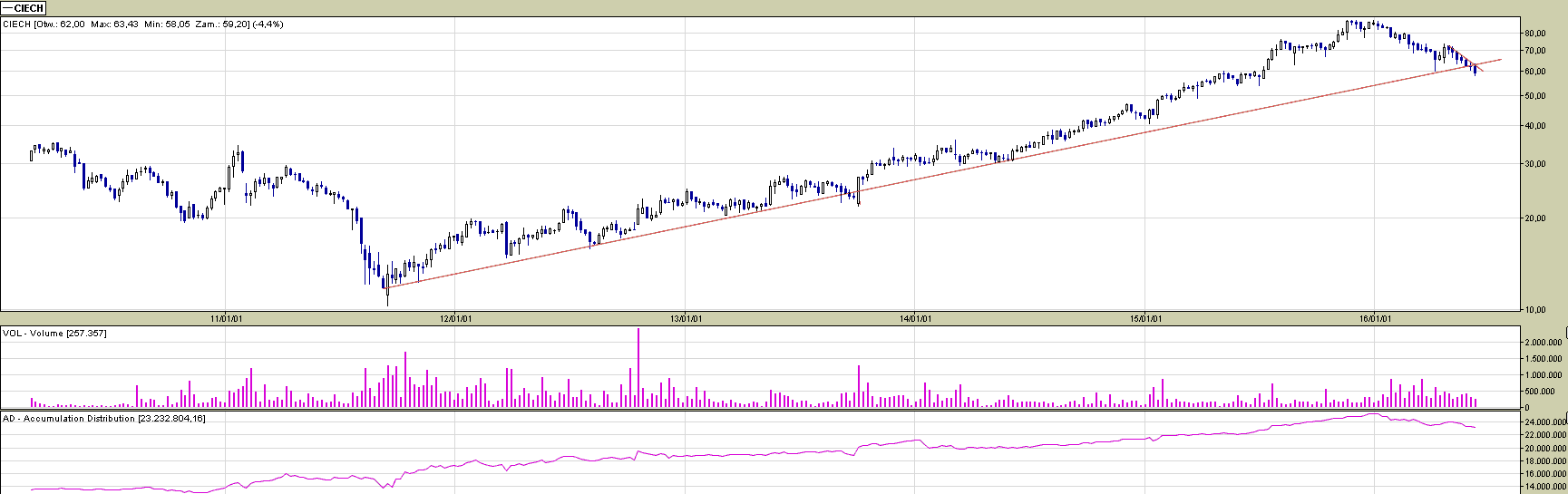 Spółka Ciech przez ponad 4 lata, czyli od połowy września 2011 do końca roku 2015, znajdowała się w niemalże bezproblemowym trendzie wzrostowym. Kurs zyskał przez ten czas niemalże 800 %, nie wliczając dywidend. Wszystko to działo się na solidnych obrotach przy odpowiedniej ilości transkacji – nie można tutaj w żadnym wypadku mówić o jednorazowych wystrzałach czy parosesyjnych rajdach znanych bardziej z indeksu NC. Od końca ubiegłego roku, kiedy to zaczęły się problemy z CBA, na wykresie spółki utworzyła się prospadkowa formacja podwójnego szczytu, która rozpoczęła mocne zniżkowanie. Łapacze ostatnich okazji niejednokrotnie musieli rewidować swoje decyzje. Spójrzmy jednak na wykres i zobaczmy czy Ciech mimo wszystko nadal znajduje się w trendzie wzrostowy.