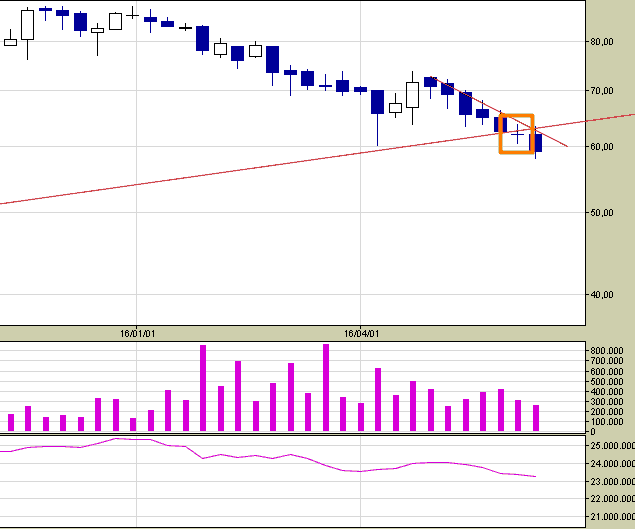 Na wykresie tygodniowym widzimy dokładnie, że jeszcze w zeszłym tygodniu kurs spółki mocno walczył o utrzymanie długoterminowej wzrostowej tendencji – utworzyła się wtedy świeczka niezdecydowania, która w takiej konstelacji nakazuje następnej świeczce wyznaczenie trendu. Następna świeczka potwierdza złą atmosferę na spółcę i łamie długoterminowy trend wzrostowy. Wydaje się zatem, że w tym tygodniu dochodzi do kolejnego potwierdzenia nowego trendu – trendu spadkowego.