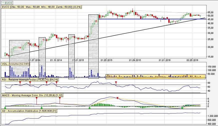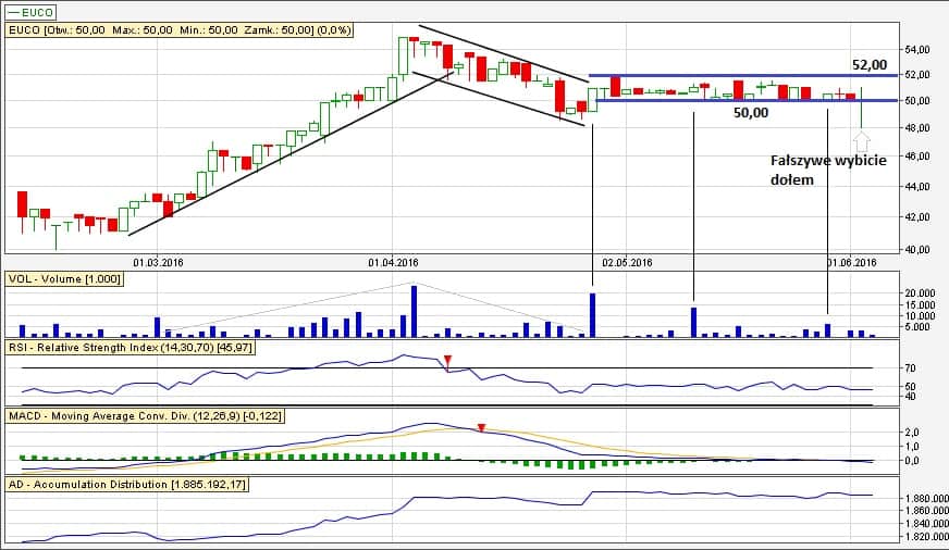 EUCO jak na razie bardzo ładnie broni poziom (50,00 zł). Jeszcze jednak nie aktywował się nasz przykładowy LimAkt.