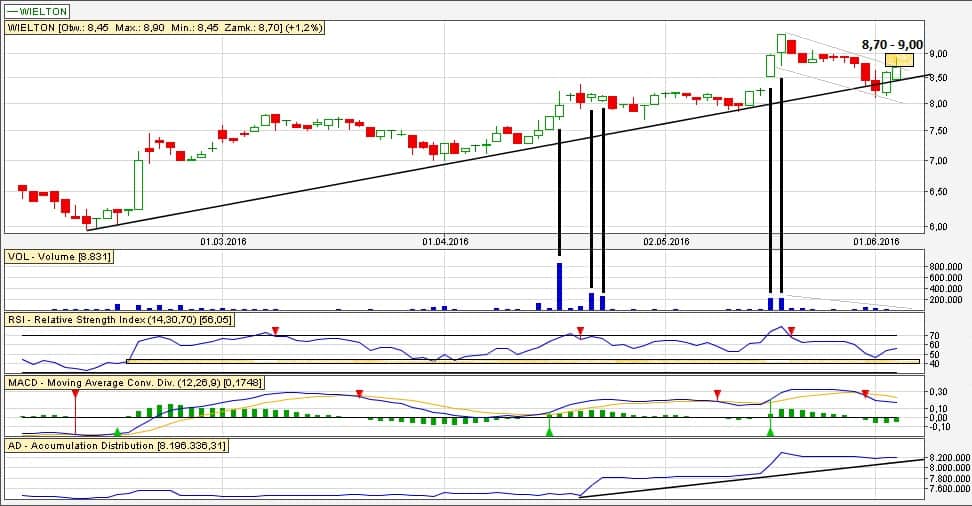 Na Wielton również formuje nam się formacja techniczna flagi. Tutaj mamy podobną sytuację jak na Comarch – jak na razie mamy sygnały kupna (wskaźniki, świece, wolumeny, zlecenia “wewnątrzsesyjne”). Podczas pisania tego wpisu kurs stał na 8,70 zł. Będziemy zagrywać pod potencjalne wybicie z flagi z poziomu 8,70 – 9,00 zł.