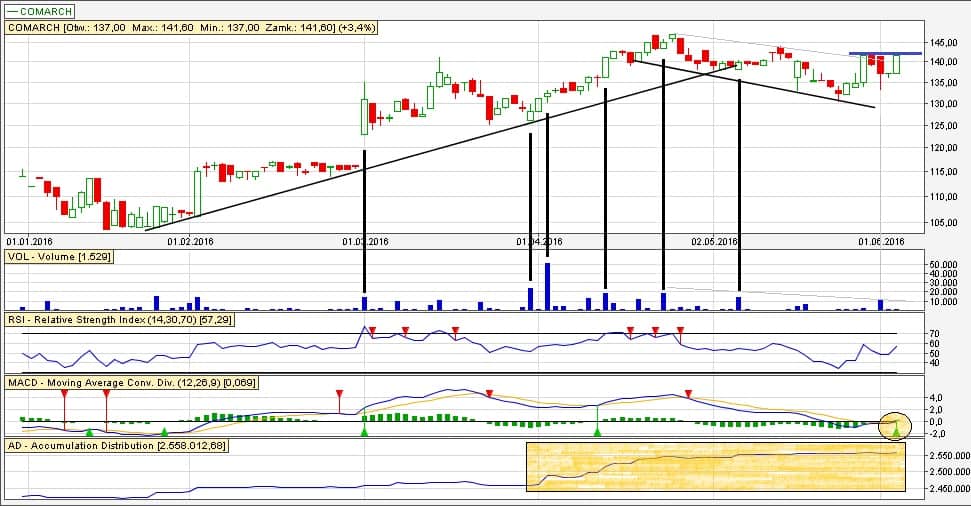 Po dłuższych wzrostach na wykresie Comarch doszło do korekty (lekkich spadków). Formowała się formacja techniczna flagi, która z natury jest formacją kontynuacji trendu (mały przystanek przed potencjalnymi, kolejnymi wzrostami). Czy mamy do czynienia z takim “przystankiem” może nam powiedzieć między innymi wolumen, który powinien maleć/zanikać podczas korekty. Tak też i jest na powyższym przykładzie. Wskaźnik akumulacji/dystrybucji (AD) również to pokazuje – nie występuje zwiększona dystrybucja na akcjach spółki. Wolumeny więc wyglądają pro-wzrostowo.
