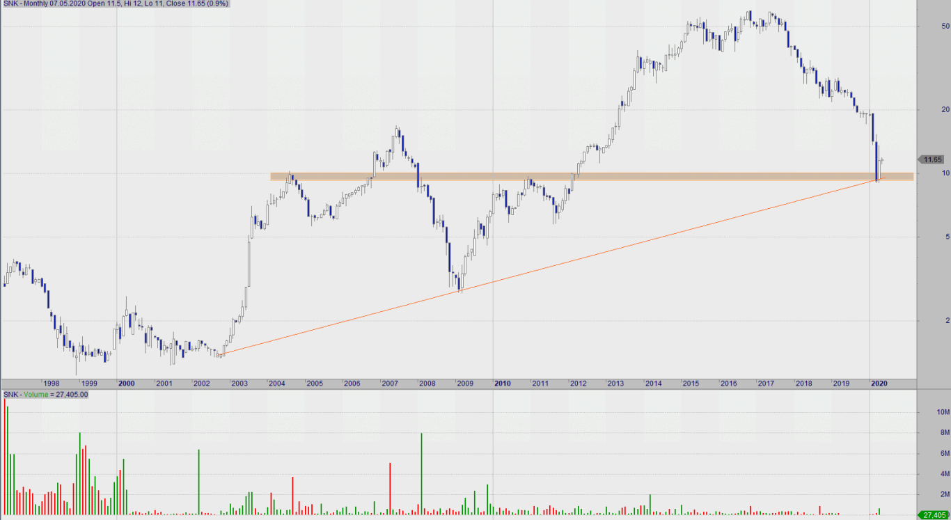 Komentarz: Pomimo że pod względem długoterminowym nadal można mówić o trendzie wzrostowym – por. wykres miesięczny -, to w perspektywie ostatnich dwóch lat kurs stale notuje nowe dołki. Przedstawione zagranie jest spekulacyjne i zostanie spalone, jeżeli kurs wybije się poniżej 11 zł, które z perspektywy dziennej oraz tygodniowej stanowić powinno wsparcie. Propozycja zagrania, to wybicie nad zniżkującą linię w krótkim terminie oraz wybicie SMA50 (11,7). Opory, to 13,3-13,5 oraz SMA100. Zwracam jeszcze uwagę na relatywnie niską płynność (dzisiaj 72.000 zł).