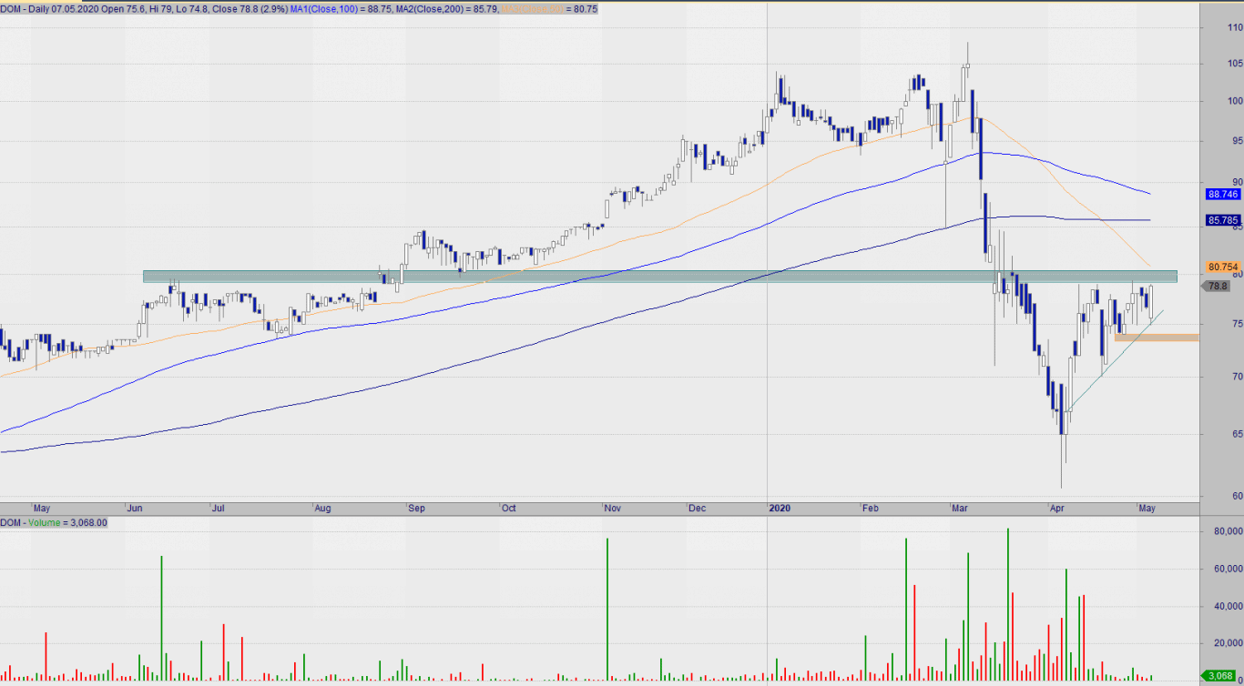 Komentarz: DOM porusza się w długoterminowym trendzie wzrostym, ale w związku z koronawirusem kurs nie powrócił jeszcze nad długoterminowe średnie kroczące. Zagranie polegać będzie na wybiciu się nad 80 zł, gdzie utworzył się opór w krótkim terminie. Wybicie przyspieszonej linii trendu wzrostowego i najbliższe wsparcia (tj. 74,70) zaneguje prowzrostowy scenariusz w krótkim terminie.