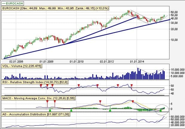 Tak jak już wspomniałem w tytule wątku: dzisiaj podaję dwie spółki, gdzie występuje długoterminowy trend wzrostowy. Na powyższym wykresie można bez problemu zobaczyć takowy trend. Również występuje wyraźne podwyższony wolumen w ostatnim czasie. Wskaźnik MACD również daje potencjalny sygnał kupna.
