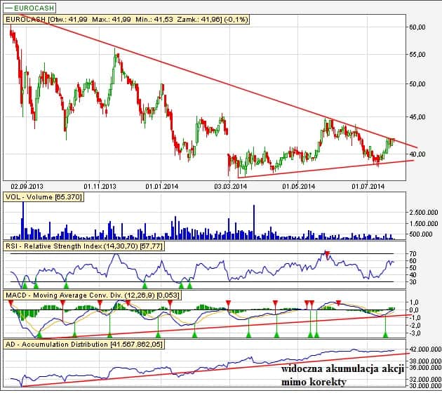 Korekta jest wykorzystywana do akumulacji akcji. Pozytywna dywergencja, która jest widoczna na wskaźniku MACD ma pozytywną wymowę. Oznacza to spore prawdopodobieństwo zakończenia się korekty.